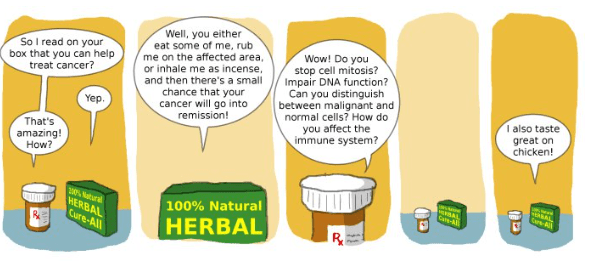 Å messe at du må holde deg unna alt som er alternativt blir noe fanatisk, men en må ta inn over seg at ikke alt er hva det utgir seg for å være. Når en del midler lover gull og grønne skoger så tar mange dette for god fisk, ja så mye fisk at en burde hatt en egen kvote. Vær skeptisk til hva du putter i kroppen. Nekter du å ta legemidler som legen forskriver så ikke gjør det på sviktende grunnlag. Tror du noen som kommer og forteller deg at remediet ala “lurium 3000” kan fikse alle sykdommer og plager og litt til, så er det reneste nonsens. Når noe høres ut til å være for godt til å være sant, så er det som regel det. Dessverre er det en del som lar seg lure av sleipe triks, fin innpakning og som ikke har kritisk sans. Noen kan også være i en desperat situasjon, de kan ha en dødelig sykdom og er villig til å prøve alt, gjerne alternative produkter som faktisk kan vise seg å være livsfarlige. Les også denne artikkelen: I’ve got nothing to lose by trying it.