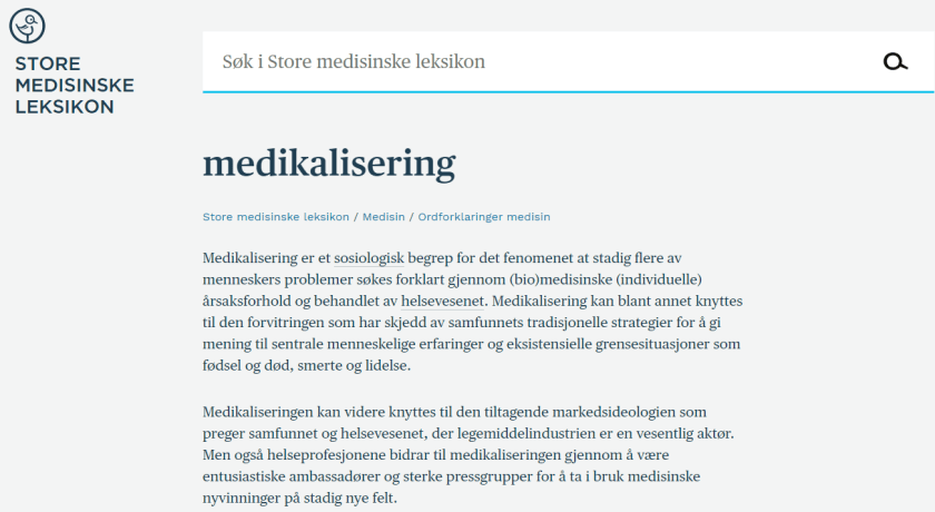 “medikalisering, et sosiologisk begrep for det forhold at stadig flere av menneskers problemer søkes forklart gjennom (bio)medisinske (individuelle) årsaksforhold og behandlet av helsevesenet. Medikalisering kan blant annet knyttes til den forvitring som har skjedd av samfunnets tradisjonelle strategier for å gi mening til sentrale menneskelige erfaringer og eksistensielle grensesituasjoner som fødsel og død, smerte og lidelse. Medikaliseringen kan videre knyttes til den tiltagende markedsideologien som preger samfunnet og helsevesenet, der legemiddelindustrien er en vesentlig aktør. Men også helseprofesjonene bidrar til medikaliseringen gjennom å være entusiastiske ambassadører og sterke pressgrupper for å ta i bruk medisinske nyvinninger på stadig nye felt”.