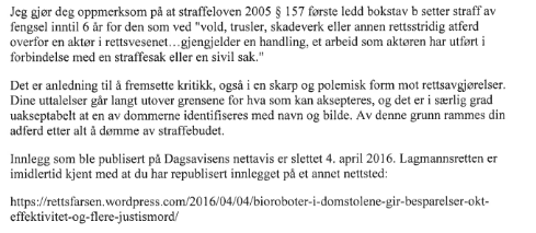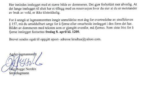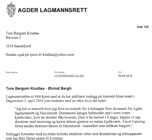 Basert på erfaringer Lagmannsretten har hatt med Krudtaa gjennom en lengre periode (se dokumentasjon lenger oppe) så er det kanskje ikke så rart at Lagmannsretten valgte å reagere og tolke dette som en trussel.