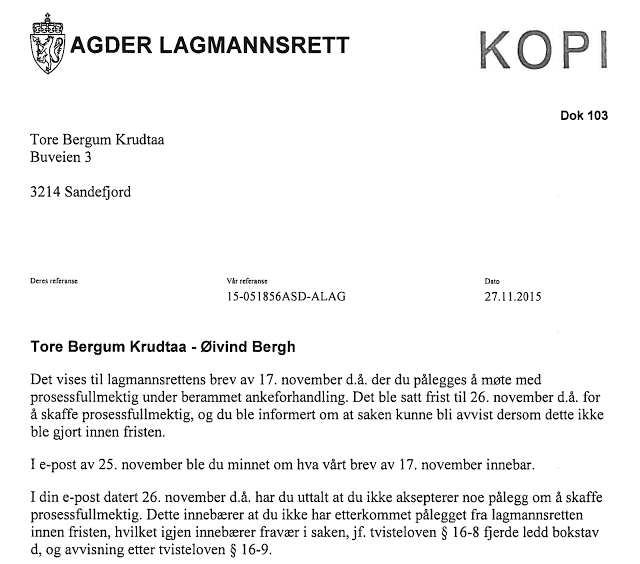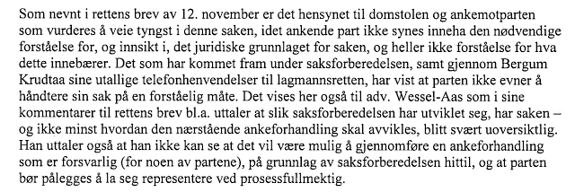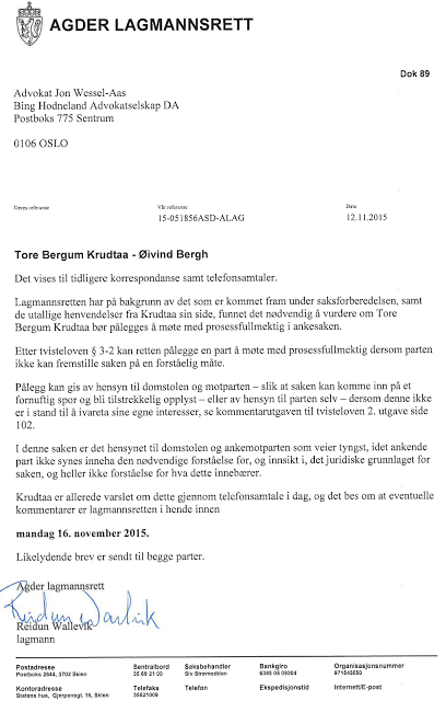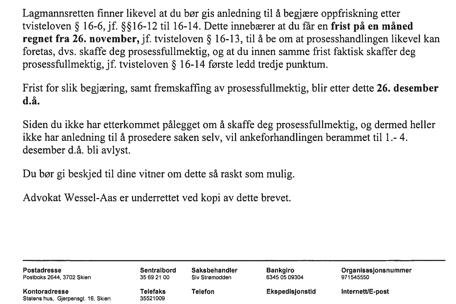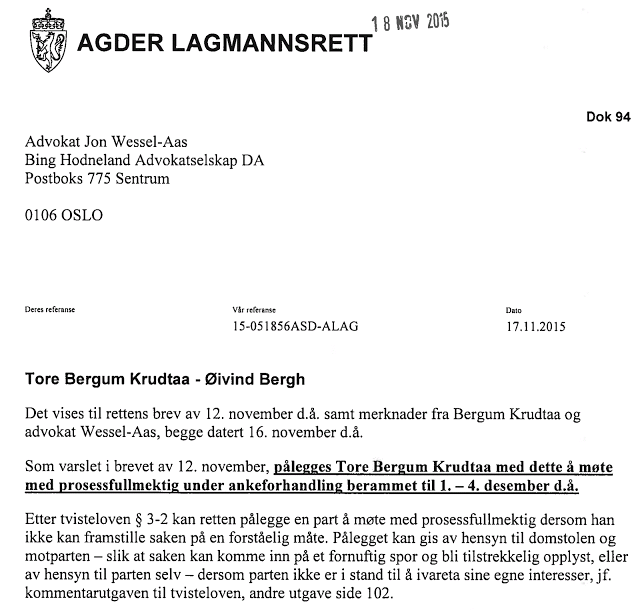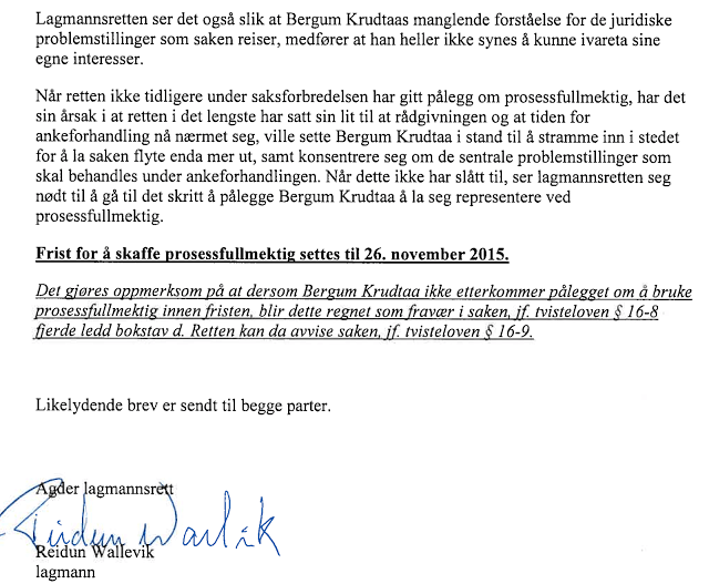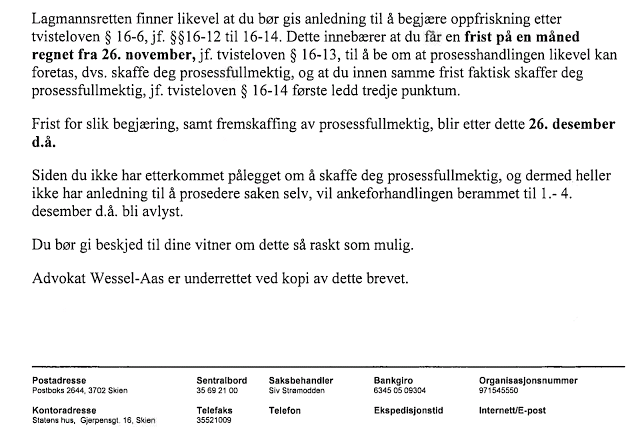 I det siste brevet, som vises under, datert 27.11.2015, får Krudtaa enda en måneds frist regnet fra den 26.11,2015 til å skaffe seg en prosessfullmektig. Ankeforhandlingene som skulle gå den 1. – 4. desember ble avlyst da Krudtaa ikke etterkom rettens pålegg om å skaffe seg en prosessfullmektig.