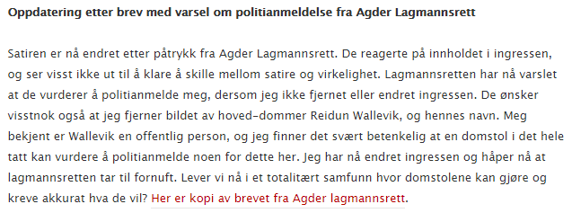 Den 01.04 i år forsøke Krudtaa seg på et satirisk innlegg på Dagsavisens nye meninger. Krudtaa kom med en dårlig skjult trussel mot dommere i Agder Lagmannsrett og Høyesterett. Innlegget på Dagsavisens nye meninger ble fjernet fjerde april, men ble liggende uredigert noen dager på hans egen blogg.
