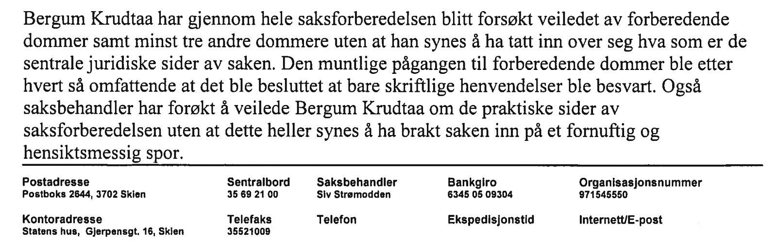 Bergum Krudtaa har gjennom hele saksforberedelsen blitt forsøkt veiledet av forberedende dommer samt minst tre andre dommere uten at han synes å ha tatt inn over seg hva som er de sentrale juridiske sider av saken. Den muntlige pågangen til forberedende dommer ble etter hvert sa omfattende at det ble besluttet at bare skriftlige henvendelser ble besvart.