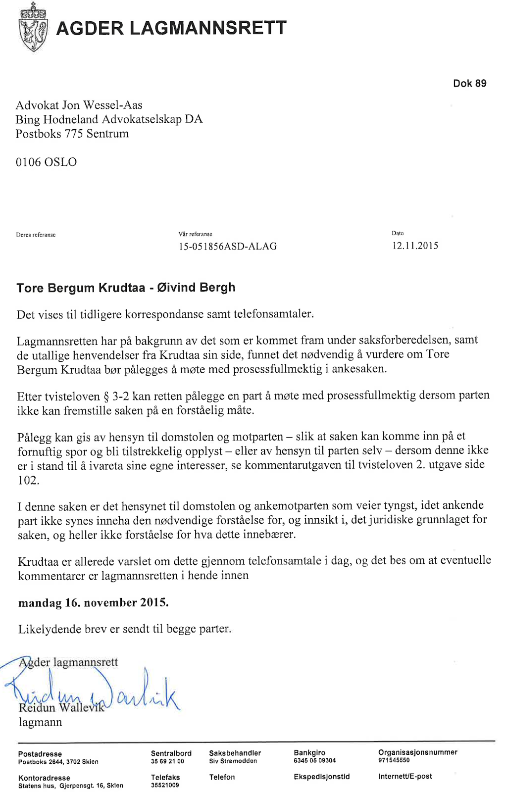 Saka gjeld pålegg om prosessfullmektig.Tore Bergum Krudtaa fekk ved lagmannsrettens vedtak av 17. november 2015 pålegg om å møta med prosessfullmektig under ankeforhandlinga 1. til 4. desember d.å. Han vart samtidig varsla om at nekting av å etterkoma pålegget ville medføra fråvere i saka og at saka kan avvisast etter tvistelova § 16-9. Frist for å skaffa prosessfullmektig vart sett til 26. november 2015.