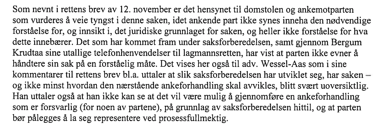 Også saksbehandler har forøkt å veilede Bergum Krudtaa om de praktiske sider av saksforberedelsen uten at dette heller synes å ha brakt saken inn på et fornuftig og hensiktsmessig spor Lagmannsretten ser det også slik at Bergum Krudtaas manglende forståelse for de juridiske problemstillinger som saken reiser, medfører at han heller ikke synes å kunne ivareta sine egne interesser.